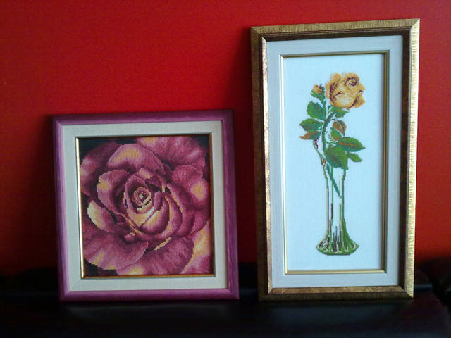 Аз като гледам повечето от Вас - какви сте производителни, и какви красиви гоблени правите... понякога ме е срам, че съм бавна. :baby: Но сега да покажа две рамкирани неща, Ленартето - отдавна съм го ушила, но сега стигна до рамка, а розата във ваза ми е подарък !